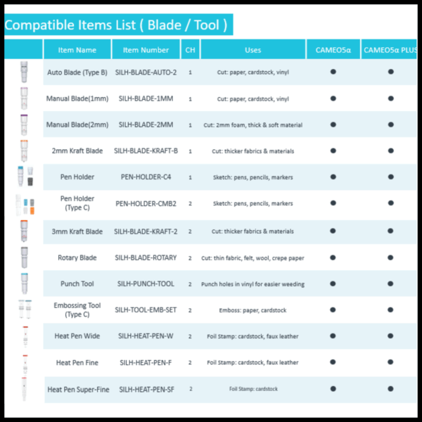 The diverse range of tools compatible with the Silhouette CAMEO5α PLUS empowers users to explore new design possibilities with ease. The Power Carriage opens creative possibilities by powering specialty tools. With tools such as the Heat Pen, Embossing Tool (Type C), and Pen Holder, creators can take their projects to the next level.