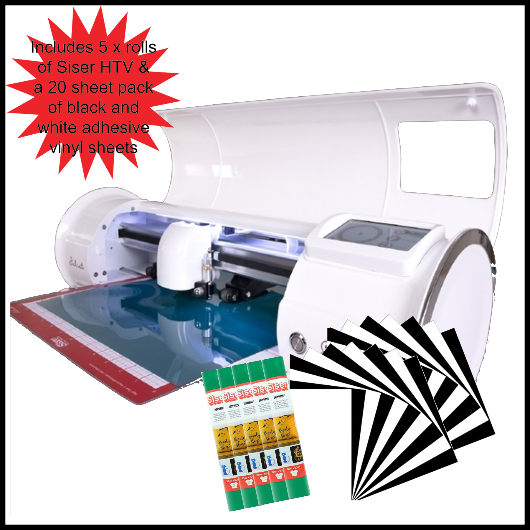 ****OUR SISER JULIET MACHINE INCLUDES 5 X RETAIL ROLLS OF SISER HTV & A 20 PACKS OF BLACK AND WHITE ADHESIVE VINYL SHEETS : TOTAL ADDED VALUE OVER $120!!!!!****